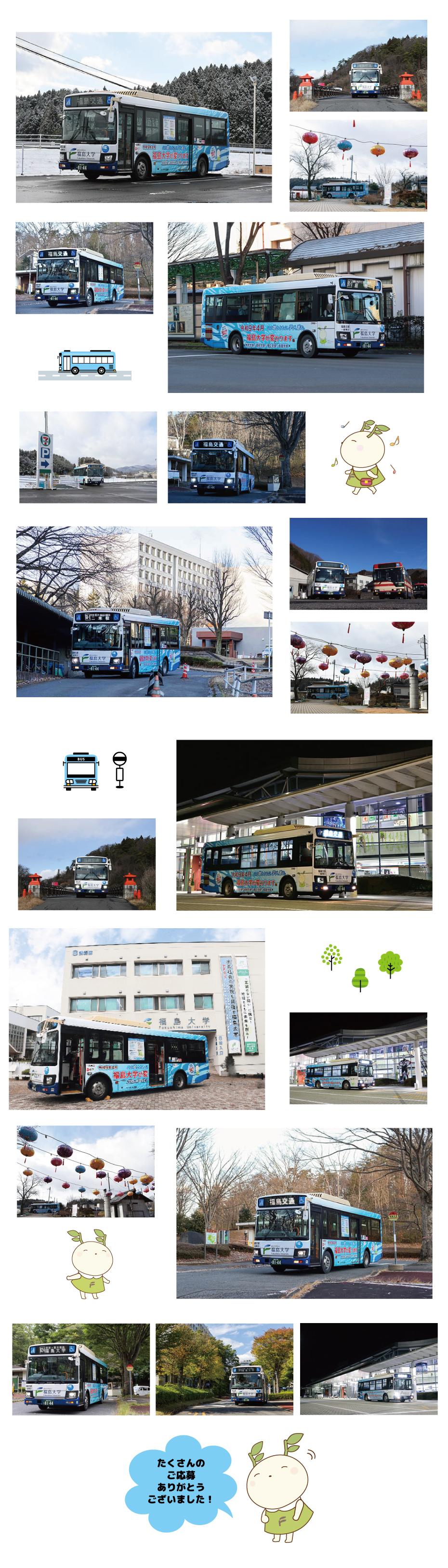 福島大学ラッピングバス写真募集に、ご応募いただきありがとうございました!ラッピングバスの魅力をさまざまな視点で切り取った写真をご紹介します。