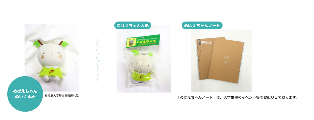 ※「めばえちゃんフィギュア」および「めばえちゃんぬいぐるみ」は、福島大学基金にご支援いただいた方への寄附返礼品となっております。
