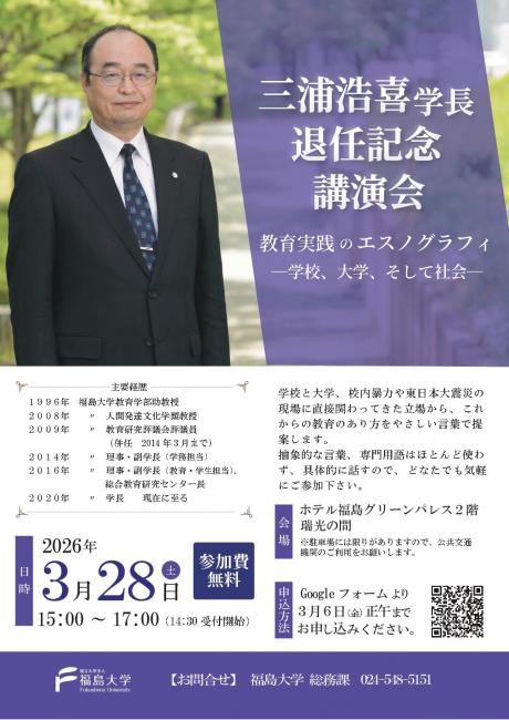 三浦 浩喜 学長が任期満了により令和8年3月末をもって退任するにあたり、下記の通り「退任記念講演会」を開催いたします。参加は無料です。